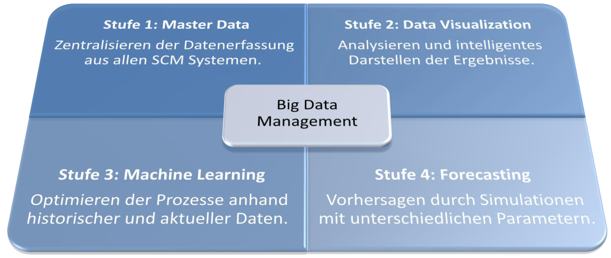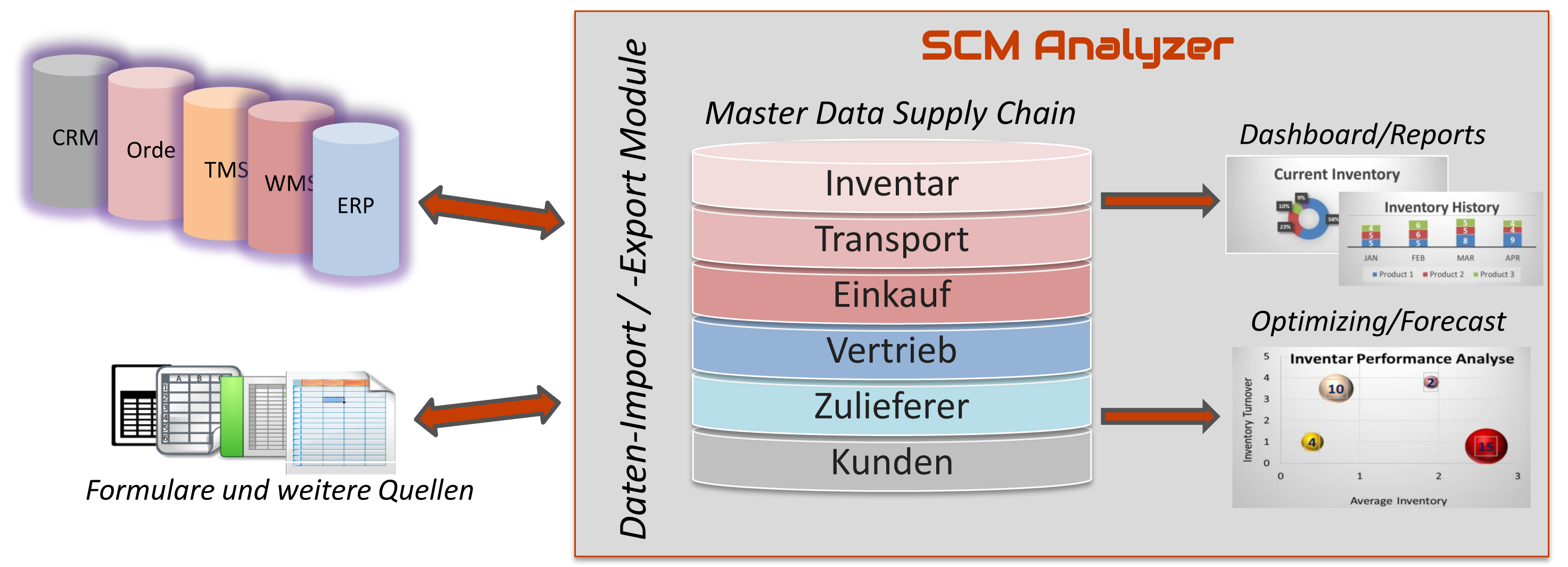 Mit unserem SCM Analyzer bieten wir eine vernetzte SCM-Lösung an, die es ermöglicht, die Genauigkeit von Vorhersagen zu erhöhen, Betriebskosten zu senken und die Flexibilität hinsichtlich Kundenerwartungen zu verbessern. Wir nennen es “Intelligent Supply Chain Big Data Management”.